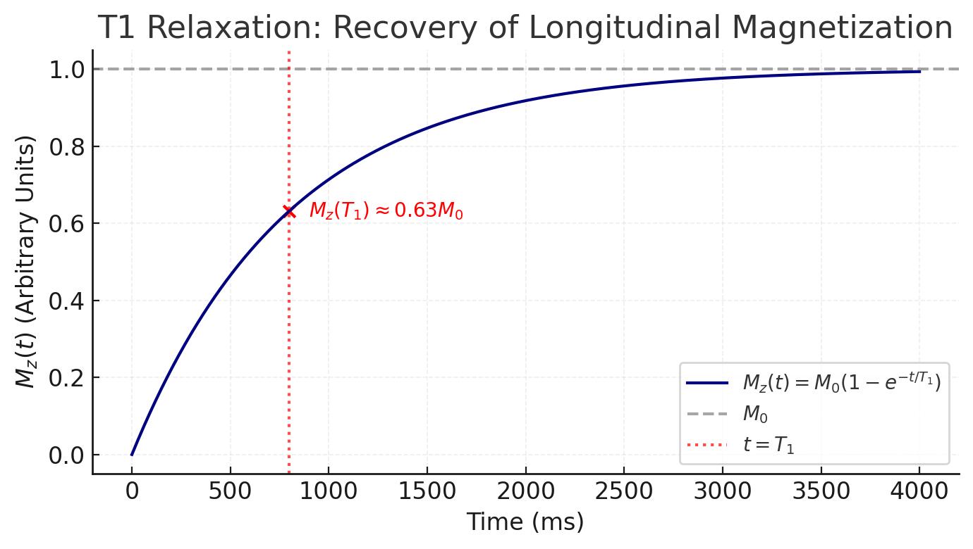 - T1 relaxation (longitudinal or spin-lattice relaxation): This is the recovery of back to its equilibrium value along the z-axis (parallel to ). Physically, the spin system releases energy to the surrounding lattice (the molecular environment) as spins realign with the field. The regrowth of follows an exponential recovery: