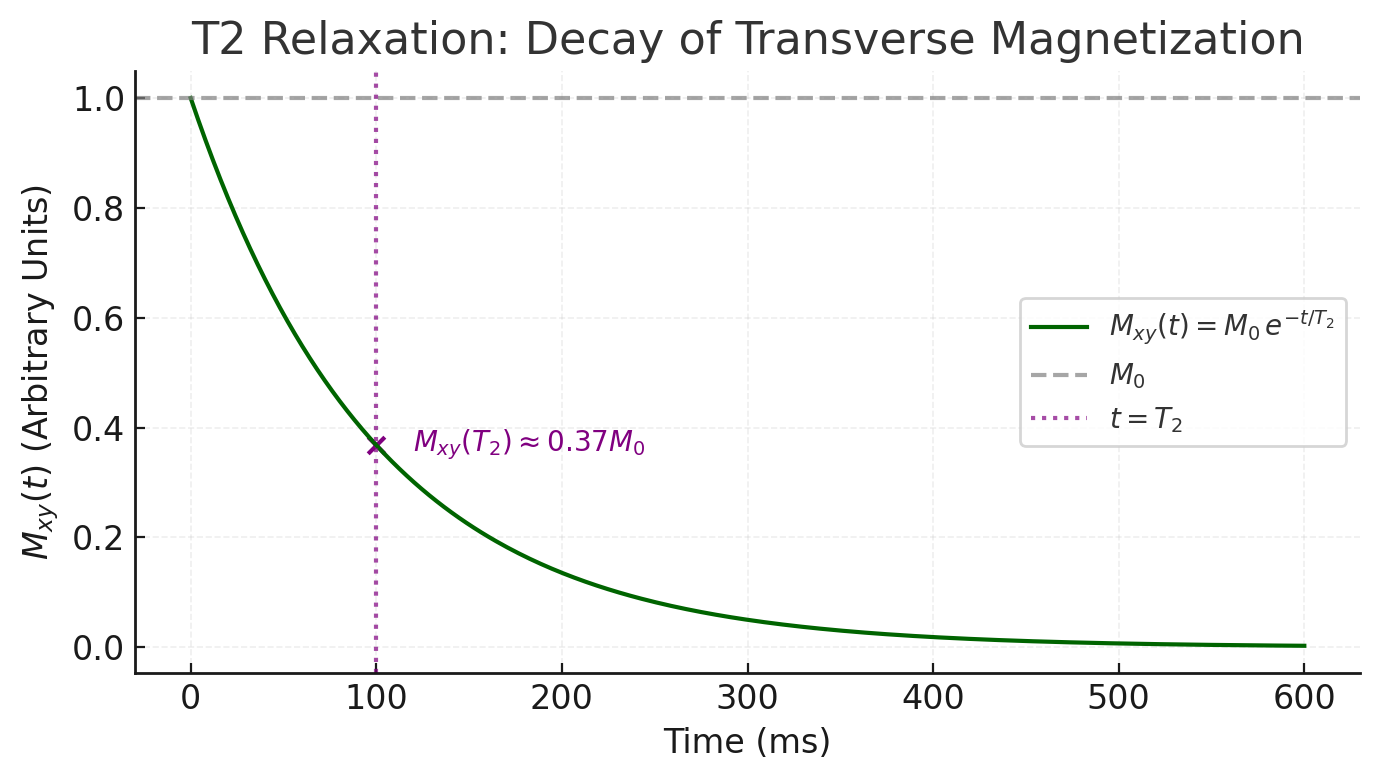 - T2 relaxation (transverse or spin-spin relaxation): This is the decay of in the transverse plane due to dephasing of individual spins. Immediately after an RF pulse, the spins are momentarily in phase, but various interactions cause them to fall out of phase with each other over time, leading to a loss of net transverse magnetization. The decay of is exponential:
