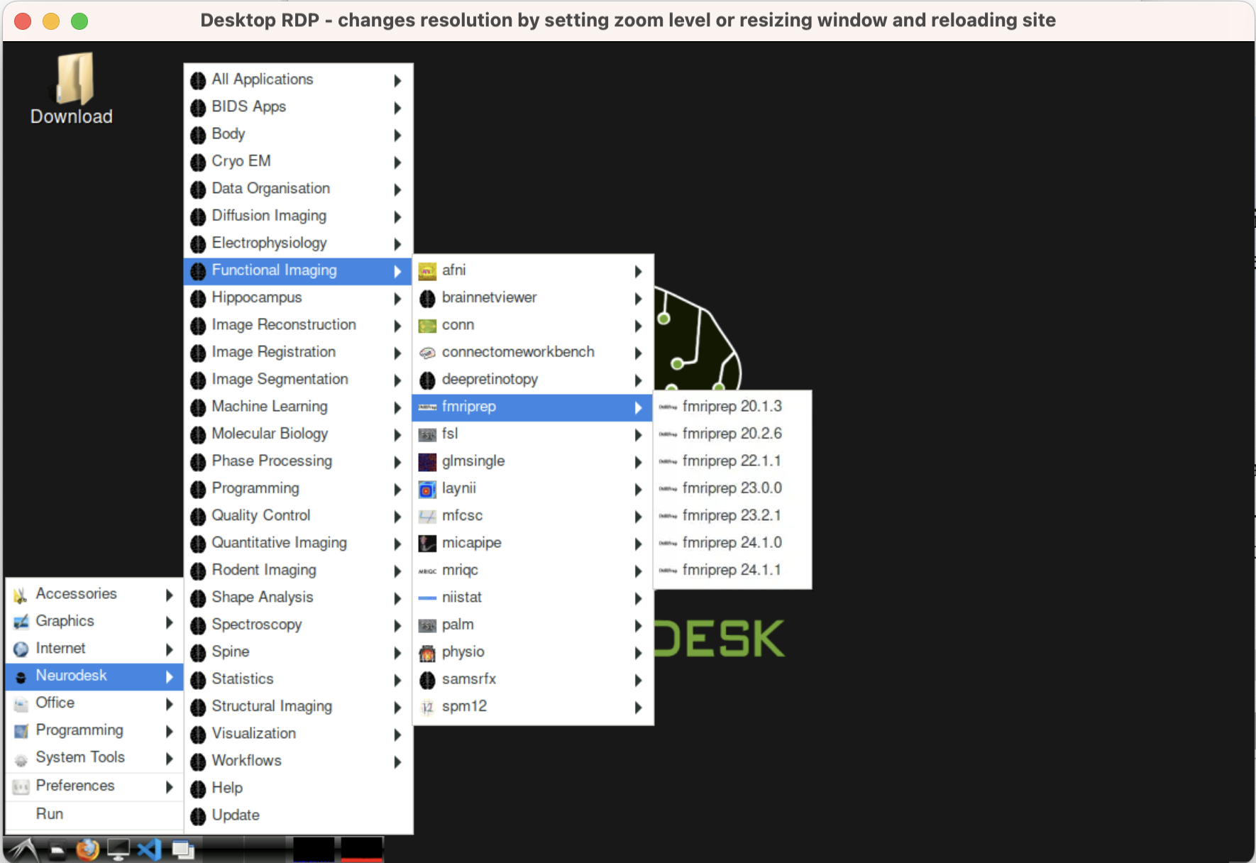 The Neurodesk App can be launched directly from your operating system’s application menu, or by running the neurodeskapp command in the command line.