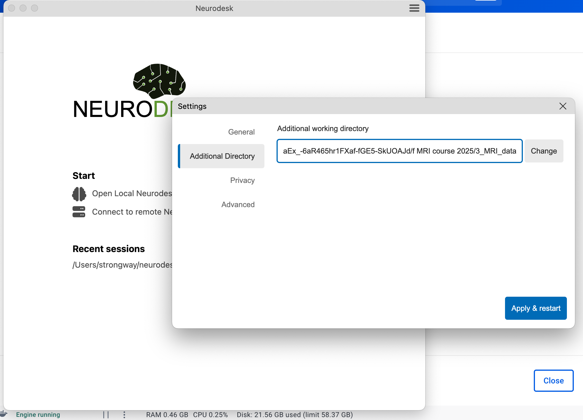 By choice, in the settings window below, select Additional Directory on the left side bar, click Change button to select the local directory, then click Apply & restart. The next time you start the app, the data from the local directory can be found in /home/jovyan/data. This is where you can read and analyze your MRI data.