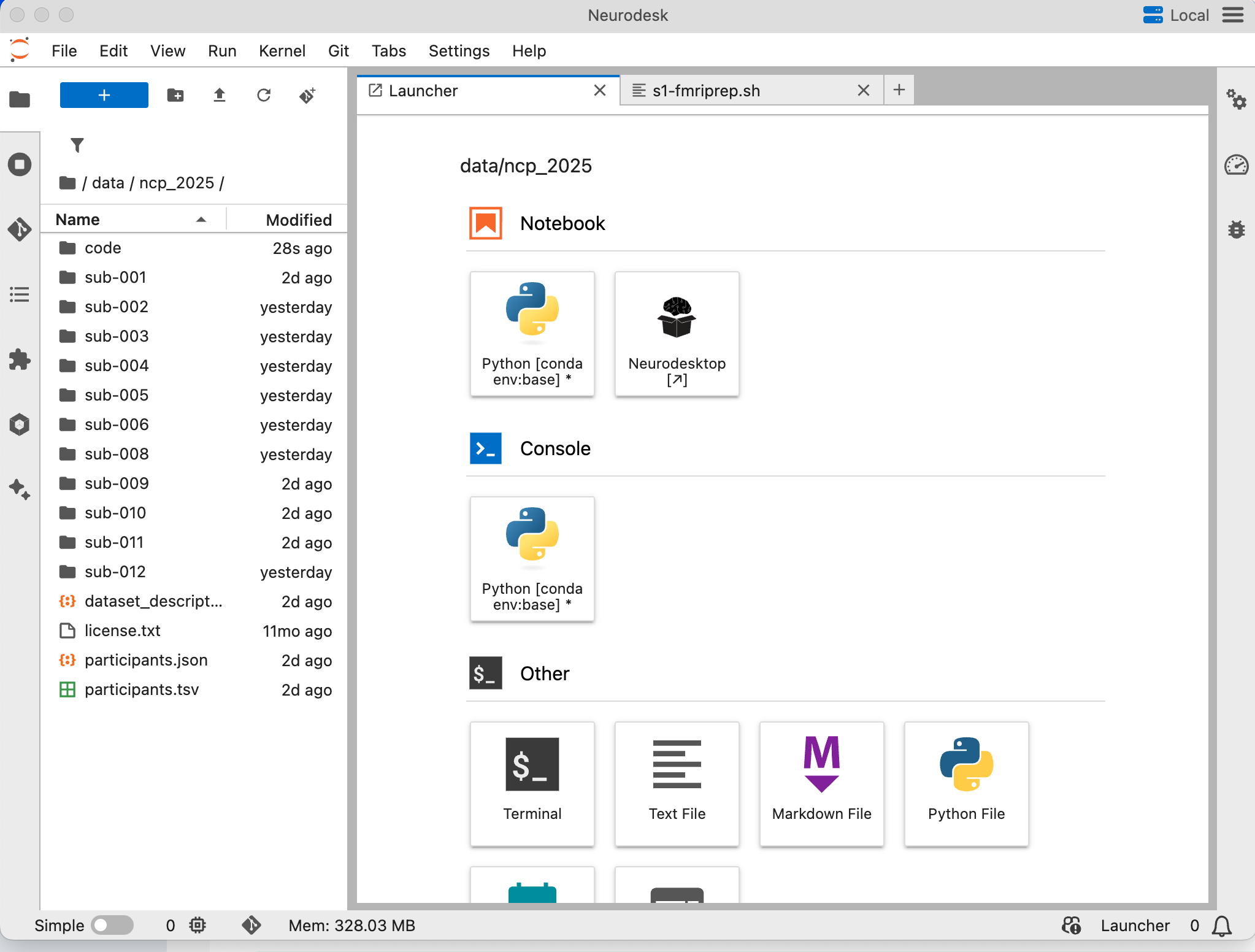 After you successfully added an external folder, you should see a similar interface as follows. If you are familiar with the Jupyter Notebook interface, you can directly work here. If you prefer Desktop, then you can double click on Neurodesktop, it will open a virtual linux desktop for you.