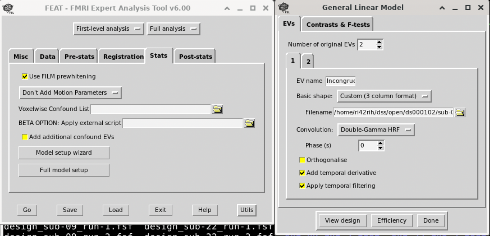 • Design Setup: • Click on “Stats” in the GUI. • EVs (Explanatory Variables): Define your regressors. For each experimental condition, you can either use a block or event-related model: • Click “Add EV” for each condition. • Provide the timing file or manually input the onsets/durations. Usually we provide a three-column text for this with the option ‘Custom (3 column format)‘. Three columns are: Onset, Duration, and amplitude (1).