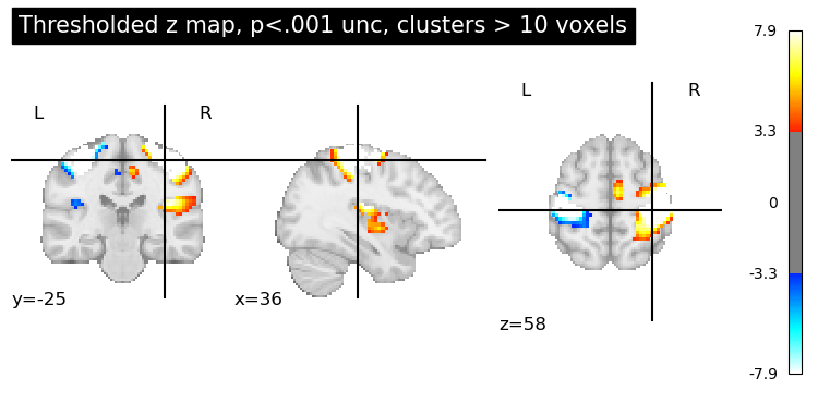 title="Thresholded z map, p<.001 unc, clusters > 10 voxels")