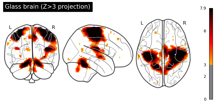 Sometimes we want a quick look at the overall pattern of activations without anatomical details. Glass brain plots show a brain outline with projections of the active regions. This is useful for checking where clusters are generally located (especially subcortical vs cortical, bilateral vs unilateral).