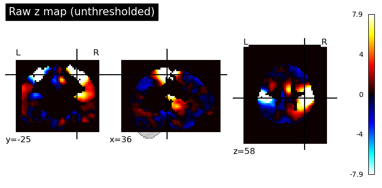 We will use each of these. First, let’s plot the unthresholded Z map to see all activations (positive and negative):